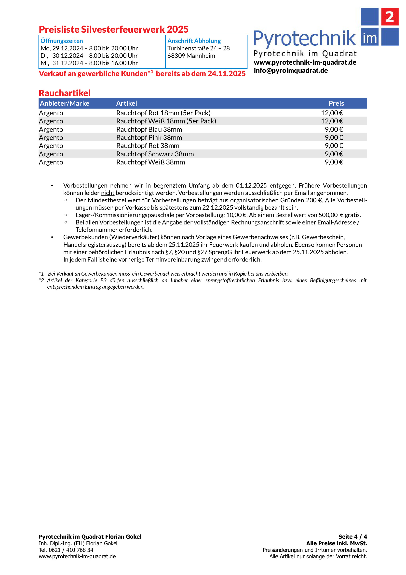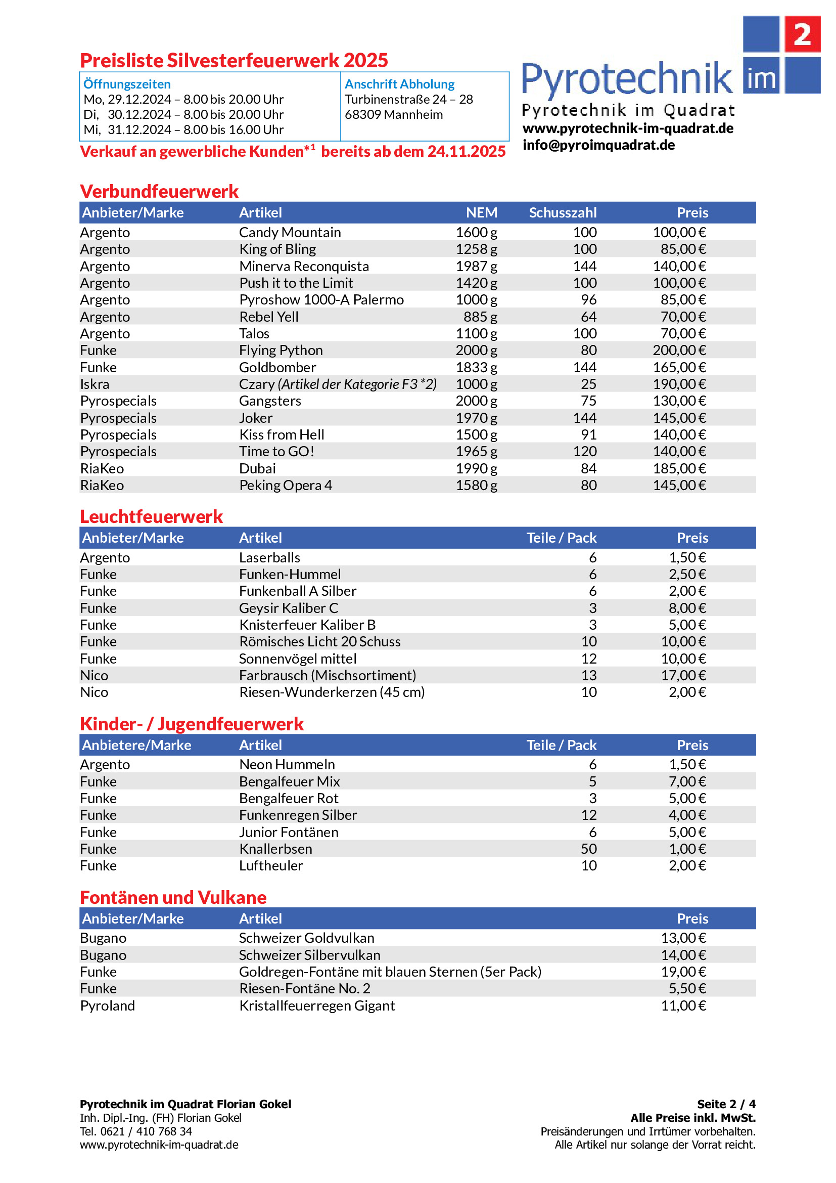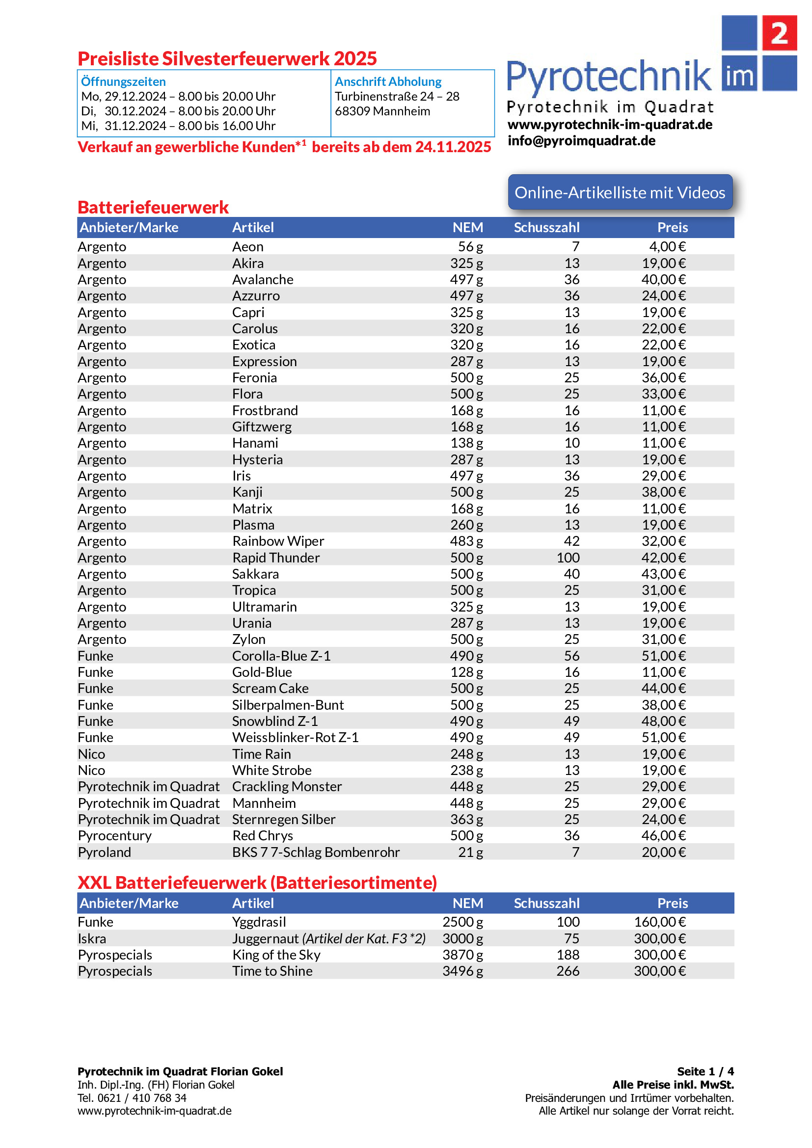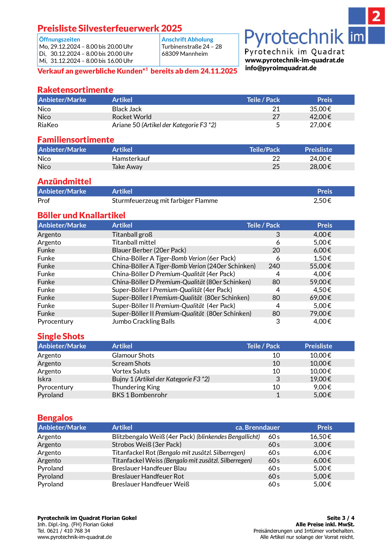 Unsere Preis- / Artikelliste des Silvesterfeuerwerkverkaufs finden Sie auch als PDF-Dokument unter diesem Link.